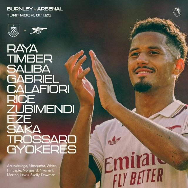 英超第10轮,阿森纳客战伯恩利,赛前阿森纳首发阵容已经出炉,具体名单如下: 阿森纳首发:拉亚 / 廷伯、萨利巴、加布里埃尔、卡拉菲奥里 / 埃泽、苏维门迪、赖斯 / 萨卡、哲凯赖什、特罗萨尔